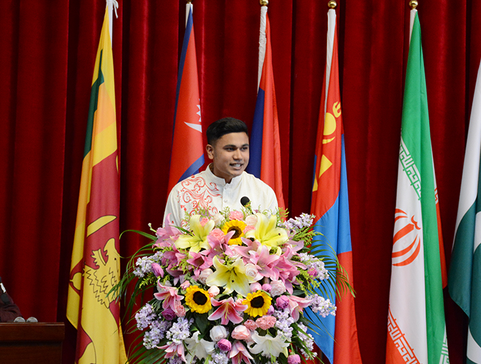 仪式上,国际学院负责人王文君、2017级本科酒店管理专业的孟加拉籍留学生阿里夫分别做了交流发言,学校留学生还表演了各国富有异域民族特色的文艺节目。