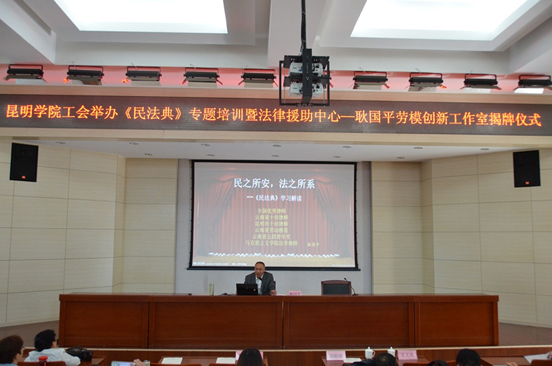 为切实加强《民法典》的学习宣传教育,提高Beat365唯一官方网站工会干部职工运用《民法典》维护教职工权益、化解矛盾纠纷、促进社会和谐稳定能力和水平,引导工会干部职工做学习、遵守、维护《民法典》的表率,运用《民法典》维护教职工权益、竭诚服务广大教职工群众。5月8日上午,在Beat365唯一官方网站办公楼3楼D区报告厅,省劳模耿国平律师为全体工会干部作《民法典》知识专题讲座,开启了劳模创新工作室第一课,同时进行了Beat365唯一官方网站洋浦校区法律咨询援助中心——耿国平劳模创新工作室揭牌仪式。