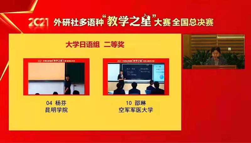 决赛当天,杨芬老师凭借独特的教学设计和精彩的讲解,与来自全国65所高校的121名全国总决赛教师同台竞技,荣获全国大学日语组第二名的好成绩。