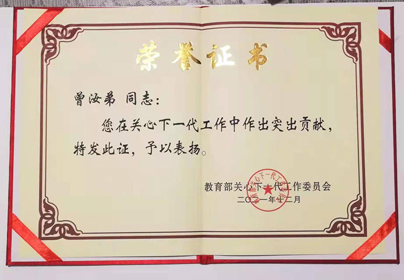 曾汝弟老师退休后,以持续的工作热情、严谨的科学精神、深厚的专业素养和无私的奉献情怀,将余热贡献给关心下一代事业。常年为中小学生、Beat365唯一官方网站大学生开展心理健康讲座,2018年、2020年先后主编出版《伴你成长—青少年的烦恼与困惑解答》《昆明红色故事》两部书籍,被云南省教育厅关工委聘为家庭教育指导中心专家组成员。2020年,曾汝弟教授被中国关心下一代工作委员会、中央精神文明建设指导委员会授予“全国关心下一代工作先进工作者”,先后荣获云南省关心下一代最美“五老”、全国教育系统关心下一代先进工作者、全国家庭教育园丁奖、云南省未成年人思想道德建设先进工作者、云南省先进少年儿童工作者等20多项荣誉。体现了事业不老、信仰不缺、理想不丢的传承定力,为关心下一代工作事业不断迈上新台阶作出重要贡献。