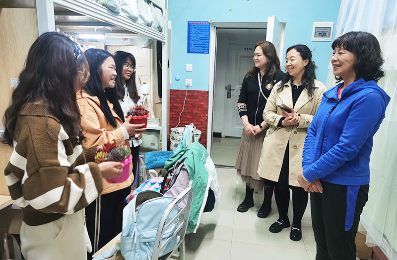 在女生宿舍,李莉副书记与同学们亲切交流,了解同学们的学习生活情况,询问其在生活和学习中存在的困难,听取同学们对学校教育教学、学习生活保障等方面的意见建议,并鼓励同学们要珍惜学习资源,坚定学习目标并为之不懈努力,一定会收获成功。同时还查看了宿舍环境卫生和学习活动室,强调要加强并发挥好宿舍育人功能,为女学生们提供更好的学习生活条件。李莉副书记和妇联老师们还给同学们送去了盆栽植物作为节日礼物,增添节日气氛。