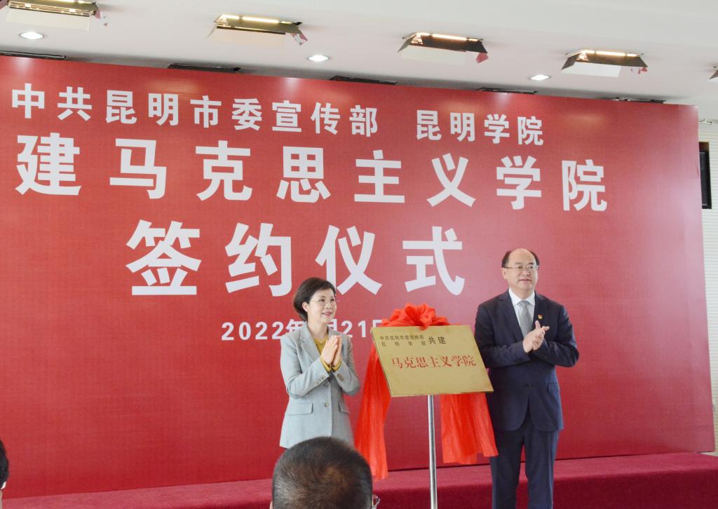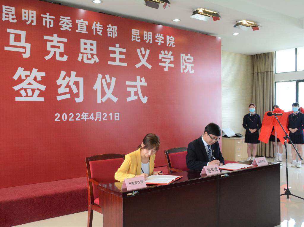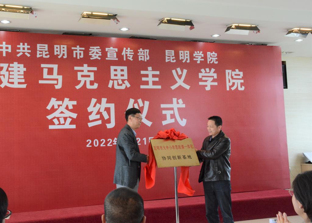 市委宣传部副部长姚晓怡和副校长、宣传部部长李剀代表双方签定共建协议书。金幼和书记、徐晓梅部长共同为“共建马克思主义学院”揭牌。市教育体育局、学校马克思主义学院负责同志为“昆明市大中小学思政课一体化协同创新基地”揭牌。