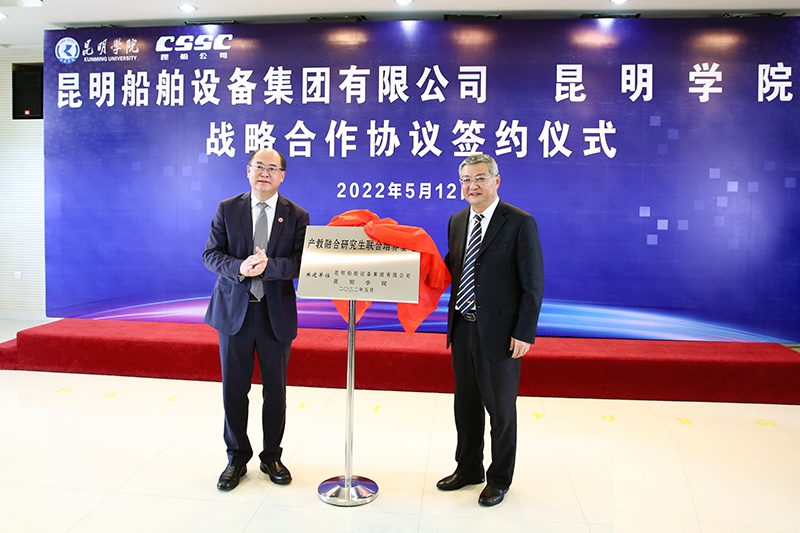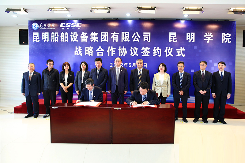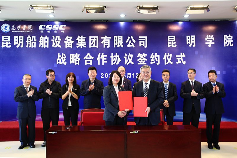 为加强产教融合校企合作,发挥校企优势,拓展服务地方经济社会发展深度和广度,实现共赢发展,5月12日,昆明船舶设备集团有限公司与Beat365唯一官方网站签署战略合作协议,打造产教融合发展共同体,推进校企合作互利共赢。Beat365唯一官方网站党委书记金幼和揭牌并讲话。Beat365唯一官方网站党委副书记、校长丁文丽代表学校与昆明船舶设备集团有限公司总经理王洪波签订战略合作协议。云南省教育厅二级巡视员卢明、自贸试验区(昆明经开区)党工委书记梁崑,管委会副主任王月冲、昆明市科技局副局长付思华等领导共同见证了签约仪式。