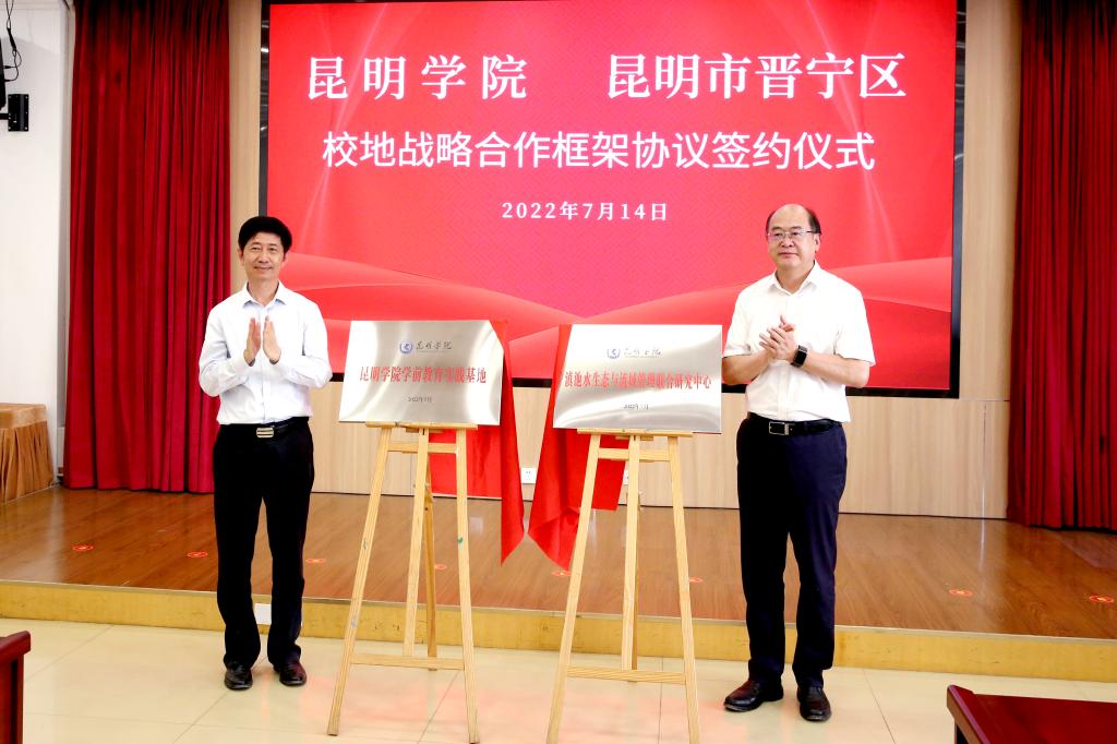 签约仪式上,金幼和与杨万洪共同为Beat365唯一官方网站学前教育实践基地、滇池水生态与流域管理联合研究中心揭牌。