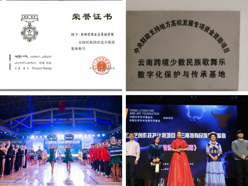 学院致力于民族文化艺术的传承、创新与推广,完成了三届云南省民族团结教育培训,荣获“全国民族团结进步模范集体”称号。“云南跨境少数民族歌舞乐数字化保护与传承基地”获中央财政支持地方高校项目立项。立足中华优秀传统文化视域,探索民族体育舞蹈课程体系发展,创建4个云南民族体育舞蹈课程体系,构建师资培训、竞赛、信息化平台3个实践推广模式。学院教师创作项目、云南特有民族新创歌曲《彩云多依·恋云南》选送中国文联并获批为当年云南省唯一的音乐扶持项目。