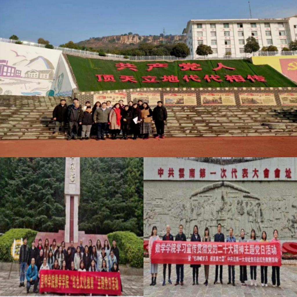 抓思想、强党性,丰富党建活动内容形式。组织师生党员赴丽江华坪女子高级中学开展“向张桂梅老师学习”主题党日活动,接受红色女高特有的党性教育,该新闻被云南网、春城晚报、昆明日报、云报客户端等宣传报道。组织师生党员赴宜良开展“红色文化教育”主题党日活动、赴蒙自查尼皮开展“学习宣传贯彻党的二十大精神”主题党日活动,传承红色基因,赓续共产党员精神血脉,将初心使命转化为学习工作的动力之源、力量之基。
