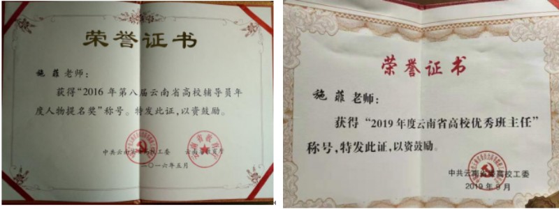 学院努力建设高水平的辅导员队伍,定期开展辅导员专题培训、辅导员助理“沙龙”等活动,为辅导员及助理打造交流心得、分享经验、研讨工作的平台。学院专职辅导员施菲老师2016年荣获“云南省辅导员年度人物提名奖”,2019年荣获“云南省优秀班主任”荣誉称号。