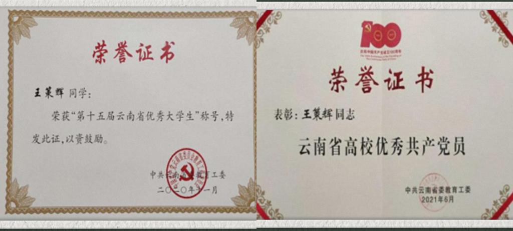 2022届优秀毕业生王策辉,连续两年荣获“国家励志奖学金”、“云南省政府奖学金”;积极参加各类学科竞赛,荣获全国大学生数学建模竞赛云南省本科组二等奖;荣获“第十五届云南省优秀大学生”、“省级三好学生”、 “云南省高校优秀共产党员”荣誉称号,毕业后选择扎根基层到勐腊县任教。