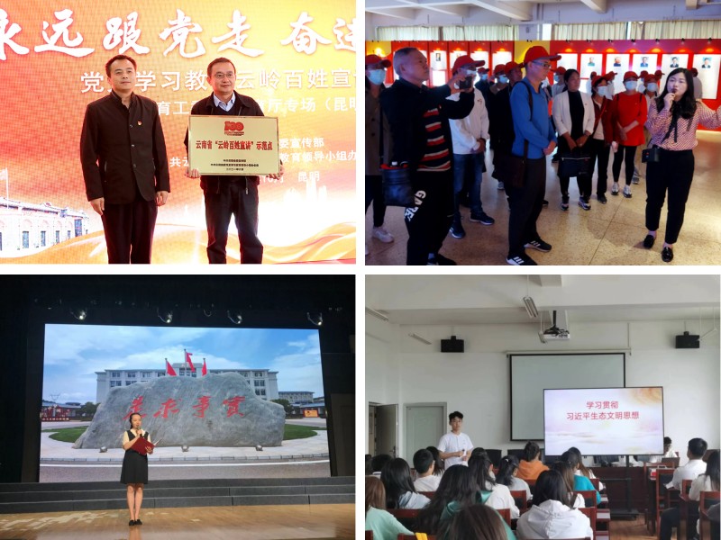 学院围绕学校改革发展大局和学院中心工作,充分发挥政治引领作用,把全面加强党的领导贯穿于立德树人全过程。一是深化理论学习,抓实理论研究阐释。充分利用党组织理论学习、周五学习、“学习强国”、“云岭先锋”、“周末大讲堂”各类学习平台,组织党员、干部开展学习教育,做到学习教育全覆盖,做到理论学习与教学工作相融合、相促进。发挥学科优势,深入研究阐释马克思主义中国化理论成果、习近平新时代中国特色社会主义思想,积极参与昆明市理论和政策咨询,努力发挥马克思主义学院在理论研究和解决现实问题中的智库作用,多篇决策咨询报告被地方政府采纳和转化为工作文件。二是加强党组织建设,抓强理论宣传教育。围绕“突出重点、凝练特色、创建品牌”的工作目标,严格落实支部规范化标准化建设,通过组织师生党员到扎西、嘉兴、遵义研学,不断增强党支部的凝聚力和战斗力。引导教师发挥专业优势,成立党的创新理论师生宣讲团,打造有影响力和感染力的理论宣传平台,深入机关、学校、企业、社区,广泛开展党的理论宣传和普及,不断推进新形势下马克思主义大众化。“习近平新时代中国特色社会主义思想学习园地”被省委宣传部、省委党史学习教育领导小组办公室评为“云岭百姓宣讲”示范点,多名教师被聘为省委教育工委、昆明市委和学校党委党史学习教育宣讲团成员。三是强化多元协同,抓实思政课一体化。在学校“ 四联动”工作“大格局”(思政课各课程间联动、传统教学与新媒体联动、思政课程与专业课程联动、马克思主义学院与职能部门联动)的指导下,实现课程思政与思政课程同向同行、日常思政工作与思政课程同频共振。学校与昆明市委宣传部共建马克思主义学院,建设”昆明市大中小学思政课一体化协同创新基地”;2022年9月,与长春小学、昆明市第二中学共同组织开展“讲好聂耳和国歌的故事、铸牢中华民族共同体意识”昆明市大中小学开学第一课活动。