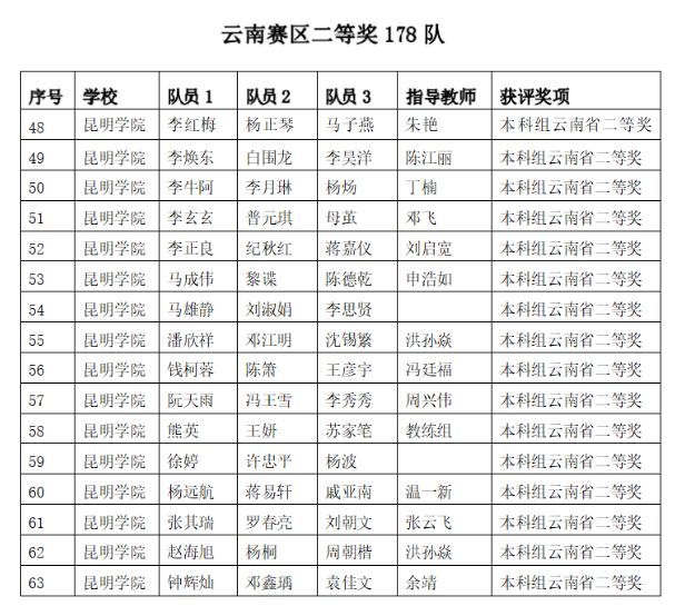 近日,云南省大学生数学建模竞赛组委会发文公布了“2022高教社杯全国大学生数学建模竞赛”获奖名单,Beat365官网参赛的129支队伍中有50支队伍获奖,其中,信息工程学院杨文博、汤淑艳、胡建金三位同学在邱莎老师指导下获得全国二等奖。
