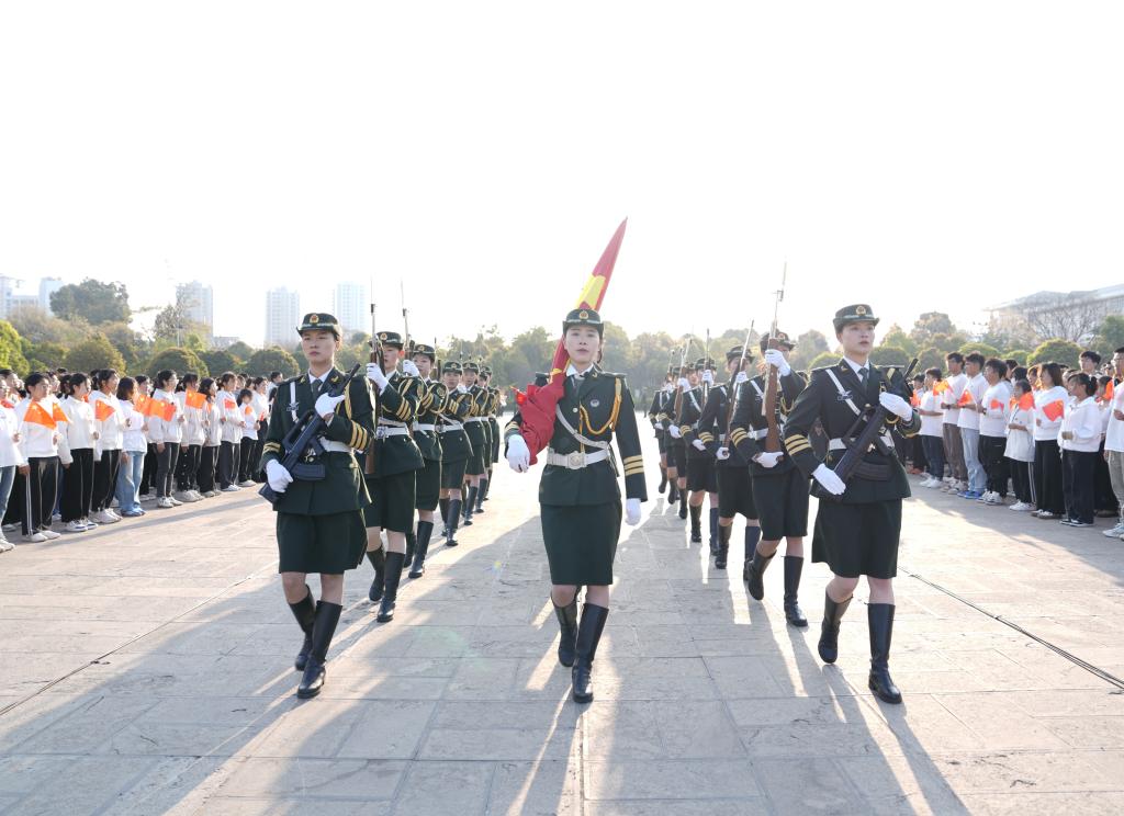 朝阳初升,师生们共聚聂耳广场。国旗班的同学们精神抖擞,迈着整齐划一的步伐走向升旗台。在高声齐唱的国歌声中,五星红旗冉冉升起,迎风飘扬,全场肃立,向五星红旗行注目礼。