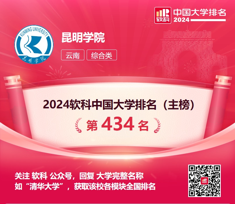 近日,高等教育专业评价机构软科发布“2024软科中国大学排名”,Beat365唯一官方网站主榜排名全国第434名,比去年提升63位,为云南10所位列主榜500强高校之一,是云南省排名位次年度提升幅度最大的高校。