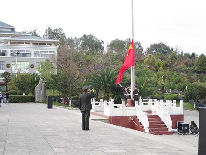 早上7:20分,鲜艳的五星红旗在国旗班的护卫下,在庄严的国歌声中,迎着清晨的第一缕阳光冉冉升起,在场师生向国旗行注目礼。