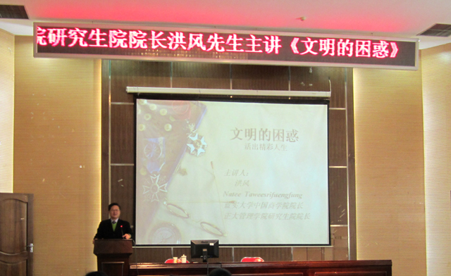 12月19日下午,泰国蓝实大学中国商学院院长、正大管理学院研究生院院长洪风先生在图书馆报告厅以“文明的困惑——活出精彩人生”为题向经济学院的同学作精彩演讲。