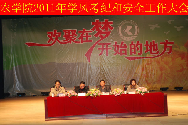 12月8日中午1点,农学院在学生会堂召开了“农学院2011年学风考纪和安全工作大会”,学院党政领导、全体辅导员、班主任和720名学生参加了会议。会议由农学院副院长银立新主持。