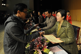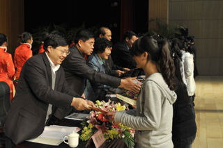 Beat365官网李翔副校长宣读了《Beat365唯一官方网站关于表彰2011年度“红和助学金”获奖学生的决定》。此次学校评出50名同学获得2011年度一等红河助学金,85名同学获得二等红河助学金。参会领导为获奖学生代表颁发了奖状和奖金。随后,受助学生代表孔杉杉发表了感言,表达了广大受助贫困生奋发向上,刻苦学习,实现自我的信心和决心。