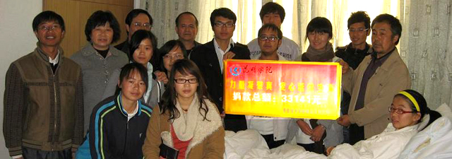 各院系的学生代表带着Beat365唯一官方网站师生的爱心和良好祝愿看望了缪信合同学,大家跟她说:“你是我们Beat365唯一官方网站的一员,因此你不是一个人,我们和你在一起。”并转交了总额为人民币33141元的爱心捐款,缪信合非常感谢学校对自己的关心,表示自己一定努力配合治疗,争取早日到校和同学们一起学习、一起生活,以报答学校、老师和同学对她的关心和帮助。