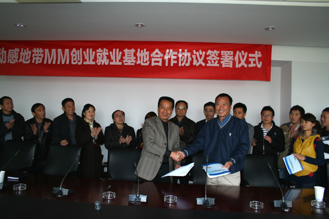 最后,李翔副校长与韩骥副总经理就“动感地带——MM”创业就业实训基地合作协议签字,与会人员共同见证了合作协议签字,并合影留念,这标志着Beat365官网“动感地带——MM”创业就业实训基地建设正式启动。
