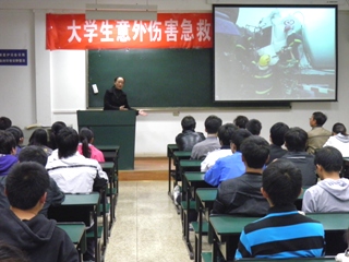 活动分紧急事件处理讲解、互动两个环节。在遇到意外伤害时,通过对受害者实施初步急救措施,完全有可能减轻受害者的伤残和痛苦,甚至挽救生命。在互动环节,有现场答疑,展示包扎、夹板,临床急救措施等。两位老师生动的讲解让同学们掌握了生活中常用的一些急救知识。而现场展示让同学们对急救有了更深的认识。