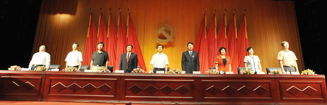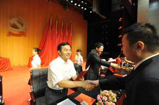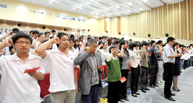 庆祝大会在全体与会人员起立高唱庄严的《国歌》歌声中开幕。130余名新党员面对党旗庄严宣誓,其中包括77岁的杨民苏和78岁的罗树玉两位新入党的老教师,他们在鲜艳的巨幅党旗下举起右手宣誓,铿锵有力的誓言给人一种无形的力量,使全体老党员重温了入党时的庄严承诺。