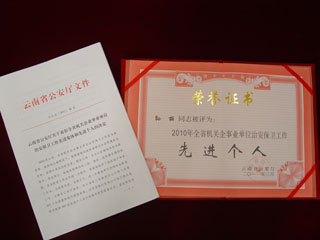 近日,云南省公安厅对2010年全省机关企业事业单位内部治安工作进行表彰,Beat365唯一官方网站保卫处再次获得“全省机关企业事业单位治安保卫工作先进集体”称号;保卫处副处长孙丽同志获得“全省机关企业事业单位治安保卫工作先进个人”称号(云公治[2011]46号)。这是保卫处在云南省公安厅对全省企业事业内部单位治安工作表彰中第三次蝉联该项荣誉称号。