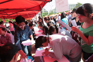 省高校工委陶晴副书记宣布“云南省2011年综合类院校毕业生和毕业研究生双向选择洽谈会暨Beat365唯一官方网站校园大型招聘会”开始。作好准备,急切就业的毕业生们有选择性地来到各用人单位招聘点进行洽谈。陶副书记在我院领导的陪同下和与会其它领导一同到洽谈现场了解毕业生和用人单位情况,听取意见和建设,并对相关工作进行现场指导。