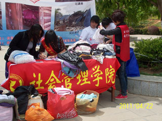 4月22日社会管理学院团总支学生会在云南省青少年发展基金会益行工作组的组织倡导下,在聂耳广场、惟实楼与博识楼之间这两个地方设点,开展了一次捐物捐资活动。