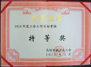 2010年学校工会在学校党政的正确领导下,带领全校1700多名工会会员暨在职教职工在工会工作中,紧密围绕学校中心工作,学校广大教职工在教学、科研、管理等各项工作中,紧扣学校改革发展,努力工作、默默奉献,认真完成工作任务,学校工会工作圆满完成了2010年昆明市工会工作责任目标,在2010年度昆明市总工会教卫文工会工作目标考核中荣获“特等奖”。