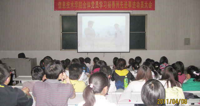 为深入贯彻学校“学习杨善洲先进事迹”的通知精神,营造学习先进、构建学习型党组织的浓厚氛围,信息技术学院党总支于4月8日在惟实楼5102阶梯教室召开了“向优秀共产党员杨善洲同志学习”的动员大会,全体党员同志观看了“杨善洲同志先进事迹报告会”和“杨善洲同志先进事迹纪录片”等视频内容。