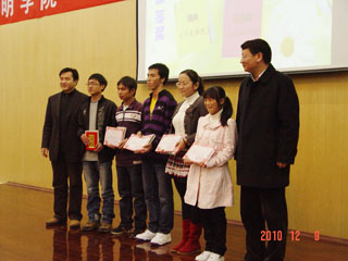 音乐系的孙兰鹃教授和在全国“青歌赛”中脱颖而出的云南歌唱组合 “一窝雀”之一的我院音乐系龚婷老师、学生 “六朵花”合唱队也赶来助兴。她们精彩的演出的演唱,同时也展现了师生爱校的情怀与丰富多姿的艺术才华。 在颁奖晚会上,梁书记和陈院长应主持人的采访,即兴发表了热情洋溢的讲话。陈院长深情地说:“听了同学们的深情朗诵,我沉了,醉了,沉醉在美丽的校园中,更沉醉在同学们的才情中。在这里,我深深感受到了作为一名参与建设洋浦校园大学校长的责任。每时每刻,我都在想,要如何把同学们培养成优秀的人才。我不懂文学,也不通艺术,但我尊重文学。没有激情,没有对生活的热爱,没有高尚的情操,是无法创作出优秀的作品的。我希望同学们能够热爱校园,热爱祖国,热爱我们的民族。很多文学家都是从校园里走出来的,很多大家都是从小事做起的。希望同学们能够跟着老师好好做学问,将来能够成为文学家、政治家、艺术家。” 紧接着梁书记动情而洪亮地表明:“刚才陈院长说出了Beat365唯一官方网站党政领导班子和我们全院教职工对同学们的心声。听了大家以‘我爱新校园’为题所创作的各种体裁的作品,我非常激动,仿佛又回到了年轻时代。我的年轻时代没有同学现在这么幸运,没有进过这么好的大学校园,我为大家能够在这样美丽的校园里读书感到欣慰,因为我们为大家创造了一个好的读书环境!我在此祝贺获奖的每一位同学,也要对参加了此次征文活动但没有获奖的每一位同学说一声:谢谢你们!你们用你们的眼睛,你们的心灵,感受到我们新校园的美丽。希望我们的新校园能够成为你们成长路上的一个为你们送行的家庭!希望Beat365唯一官方网站里的每一位同学,能够用更加壮丽的篇章,去书写你们辉煌、美丽的人生!” 最后,学院领导分别与获奖者和表演者合影留念。学院领导的深切关怀和殷切希望使获奖同学激动不已。他们说:“这么多领导给我们颁奖,对我们寄予厚望,是我们终生难忘的事情。今后我们一定要在美丽的校园努力学习,健康成长,决不辜负各位领导和老师的期望!”
