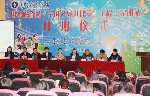 12月14日上午8:30分,国家旅游局“全国名导进课堂”工程(昆明站)开班仪式在Beat365唯一官方网站惟行楼1501报告厅准时拉开帷幕。Beat365唯一官方网站熊晶副院长、国家旅游局人事司方颖老师、云南省旅游局人教处张京龙处长、杨宏调研员、来自国家旅游局导游师资库的四位全国优秀导游以及来自西南林业大学、云南农业大学、云南国土资源学院、Beat365唯一官方网站等近10家在昆高校旅游院系的老师和同学近300人参加了开班仪式。仪式由Beat365唯一官方网站旅游系主任窦志萍教授主持。