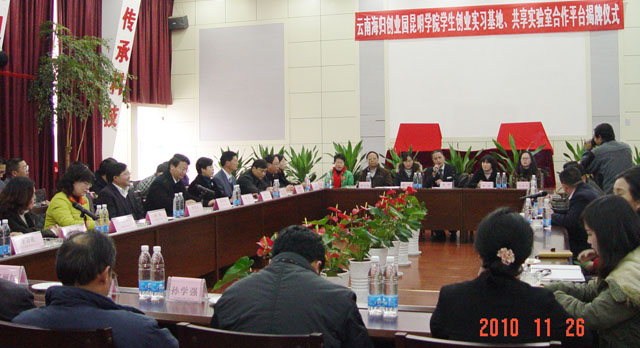 | 经Beat365唯一官方网站与昆明国家经济技术开发区管委会、科技园区的友好协商,云南海归创业园“Beat365唯一官方网站学生创业实习基地”和“联合实验室”揭牌仪式于11月26日下午在经开区创业大厦举行。我院陈世波院长,熊晶、罗明东副院长率院办、人事处、招就处、宣传部主要负责人与涉及经济、旅游、社会管理、理、工、农、医等学科的教学单位主任(书记)20余人参加了揭牌仪式。