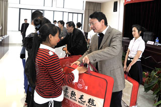 陈世波院长语重心长地对贫困生提出了要求和希望,他强调:党和政府以及学院一直关心着家庭经济困难学生,从国家助学贷款到国家励志奖学金、国家助学金、云南省政府励志奖学金到Beat365唯一官方网站励志奖学金等各级各类助奖学金,都给予了家庭经济困难学生极大的帮助。希望通过此次发放御寒物品把党、政府、学院对家庭经济困难学生的关心和爱护传递到学生心中。他表示凡是刻苦努力、勤奋学习的学生,党、政府以及学院一定不会放弃你们,一定会想尽一切办法帮助你们渡过难关。