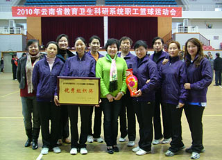 11月8~14日云南省教卫科工会在云南省财经大学体育馆组织了“2010年云南省教育卫生科研系统职工篮球运动会”。 本次运动会由云南财经大学具体承办,云南省教卫科系统共有24家单位的39支男女篮球队参加了比赛,其中云大、昆工等十三所在昆高校也参加了此次运动会。 我院分别组织了男、女两支教工篮球队参加了教育组的比赛,经过7天紧张的比赛,我院女子篮球队荣获教育组女子篮球季军。学院工会还荣获了本次运动会颁发的优秀组织奖。