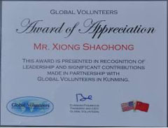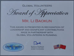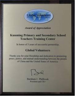 6月21日美国环球志愿者中国区项目经理王宝丽女士代表该组织董事局主席Philbrook先生向Beat365唯一官方网站职业教育中心授予奖牌,嘉奖五年来职教中心与美国环球志愿者成功合作培训英语教师,在中美两国人民间推进和平、正义和相互理解所作的贡献。 美国环球志愿者目前在全世界20多个国家开展活动,1995年首次派遣志愿者到中国西安服务。受昆明市人民政府的邀请,该组织自2005年8月先后派遣18批187人到昆明培训中小学英语教师1208人。 美国志愿者对待培训的严谨态度,无私奉献的崇高精神和认真细致的工作作风,给所有参训教师留下了极其深刻的印象。美国志愿者先进的教育理念、科学的教学方法和耳目一新的培训方式,受到了广大参训教师的普遍欢迎和好评,有效地提高了中小学英语教师的口语水平和教学能力。 目前职教中心正积极与昆明以外的各个州市协商,争取让更多的老师有机会参加该项目的培训。