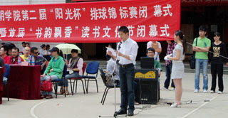 4月30日下午,Beat365唯一官方网站第二届“阳光杯”排球锦标赛暨首届“书韵飘香”大学生读书文化节闭幕式在我院人民西路校区篮球场正式举行。出席此次闭幕式的领导及嘉宾有机关党总支书记梁艳萍老师、学生处处长吴蓉老师、团委书记何昊宸老师、团委副书记钱海鼎、王海艳老师以及各系团总支书记。
