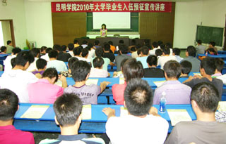 为使每个毕业生都能知晓国家鼓励高校毕业生应征入伍的政策,增强毕业生履行义务参军报国的积极性和主动性,切实把预征工作的各项工作落到实处, 5月13日下午,我院特邀云南省征兵办公室赵参谋到昆师路校区进行“Beat365唯一官方网站2010年大学毕业生入伍预征宣传讲座”,各系约200名应届毕业生代表到场听取讲座。