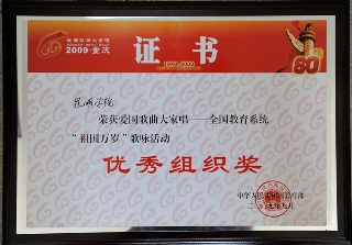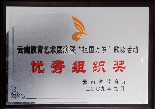 经省教育厅相关专家委员会的评审,我院学前系选送的节目大合唱《跨越巅峰》、舞蹈《傣寨春雨》荣获非专业组一等奖;音乐系选送的大合唱《和谐颂》、表演唱《滇池美》、钢琴四手连弹《A大调波兰舞曲(军队)》荣获专业组二等奖,舞蹈《红旗飘飘》荣获专业组三等奖;团委选送的舞蹈《青春击鼓》、《花之韵》荣获非专业组三等奖。我院集体先后荣获云南省教育厅颁发的“云南教育艺术展演‘祖国万岁’歌咏活动优秀组织奖”和 教育部颁发的“爱国歌曲大家唱——全国教育系统‘祖国万岁’歌咏比赛优秀组织奖”。