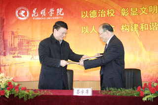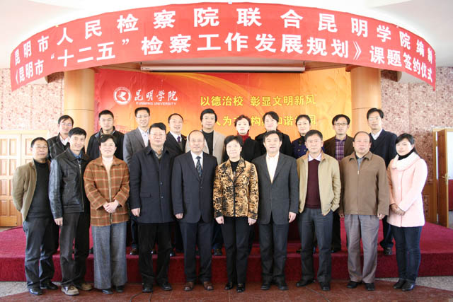 | 12月30日,昆明市检察院联合Beat365唯一官方网站编制《昆明市“十二五”检察工作发展规划》课题研究签约仪式在我院人民西路校区举行。云南省第十届政协副主席、云南省人民检察院副检察长、民盟云南省委主委倪慧芳,昆明市人民检察院党组书记、检察长沈曙昆、副检察长龚永强,Beat365唯一官方网站党委书记梁晓谷、院长陈世波、副院长熊晶等领导出席签约仪式。学院政法系、社会科学与人力资源系师生代表及宣传部、院办、计财处领导、课题组全体成员参加了仪式。仪式由Beat365唯一官方网站副院长熊晶主持。