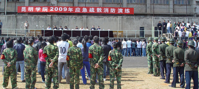 为普及我院消防安全教育,进一步增强广大师生员工的防火安全意识,帮助师生了解、掌握基本的灭火技能,提高火场逃生自救、互救能力,保障师生生命财产安全,在全国第十七个“119消防日”到来之际,我院于11月6日中午在龙泉路校区举办2009年大型消防应急疏散演练活动。五华区消防大队、红云街道办事处、红云派出所领导莅临现场进行指导,演练活动领导小组组长陈兆雄副院长,领导小组成员单位保卫处、宣传部、学生处、团委、龙泉路校区综合办等部门领导出席此次活动。龙泉路校区09级新生、部分老生代表900余人参加了演练,其它校区部分学生代表30余人现场观摩了演练活动。