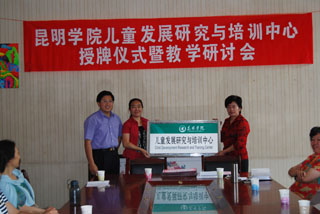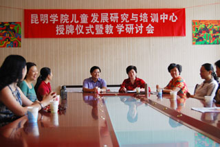 学院领导罗明东副院长亲临学前教育系指导并为“中心”授牌。参加授牌仪式的还有中心特聘专家省教育厅民办教育处李顺博士,市教科所教研室江立,西山区、盘龙区教科所教研室主任,五华区杨红工作室杨红,市一幼特级教师、园主任王珏及十五幼、市政府三幼、一幼园主任等。仪式由系副主任唐敏主持,学前系全体教职工参加并于下午开展了积极有成效的教学研讨会。