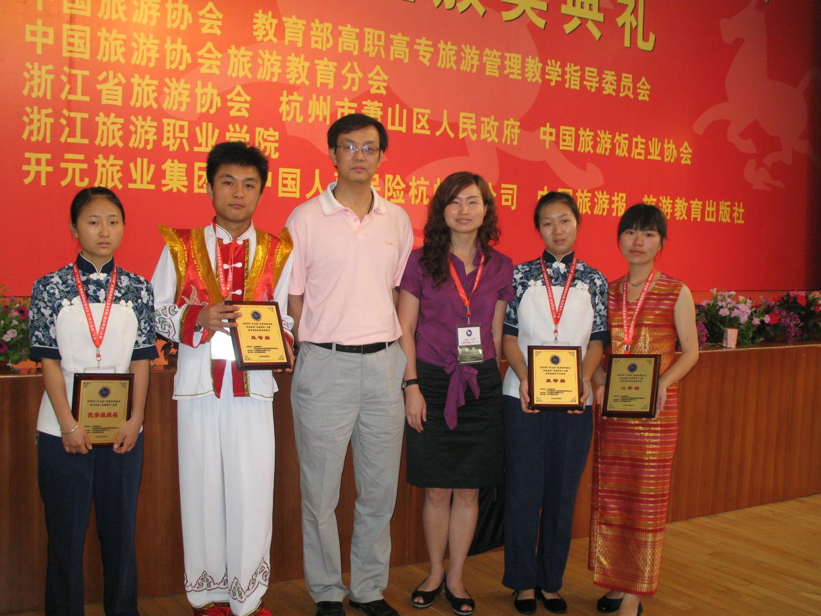 我院获奖选手接受记者采访 | 5月20日至5月24日,由中国旅游协会旅游教育分会主办、中国旅游饭店业协会和浙江省旅游协会协办、浙江旅游职业学院承办的2009年“开元杯”首届全国旅游院校服务技能(饭店服务)大赛在杭州举行。旅游系组队由系副主任吴跃辉老师带队,代表Beat365唯一官方网站参加了比赛。经过笔试、面试、技能考核、英语口试四轮激烈争夺,我系选手田银(07旅行社经营管理专业)和张智敏(06饭店管理专业)同学分别荣获鸡尾酒调制二等奖和三等奖,屠春燕(07旅游管理1班)和邓晨露(07旅游管理2班)同学分别获得中式铺床三等奖和优胜奖。4名选手同时被授予“全国旅游院校饭店服务技能大赛优秀选手”荣誉称号,我院还获得本次大赛“优秀组织奖”。