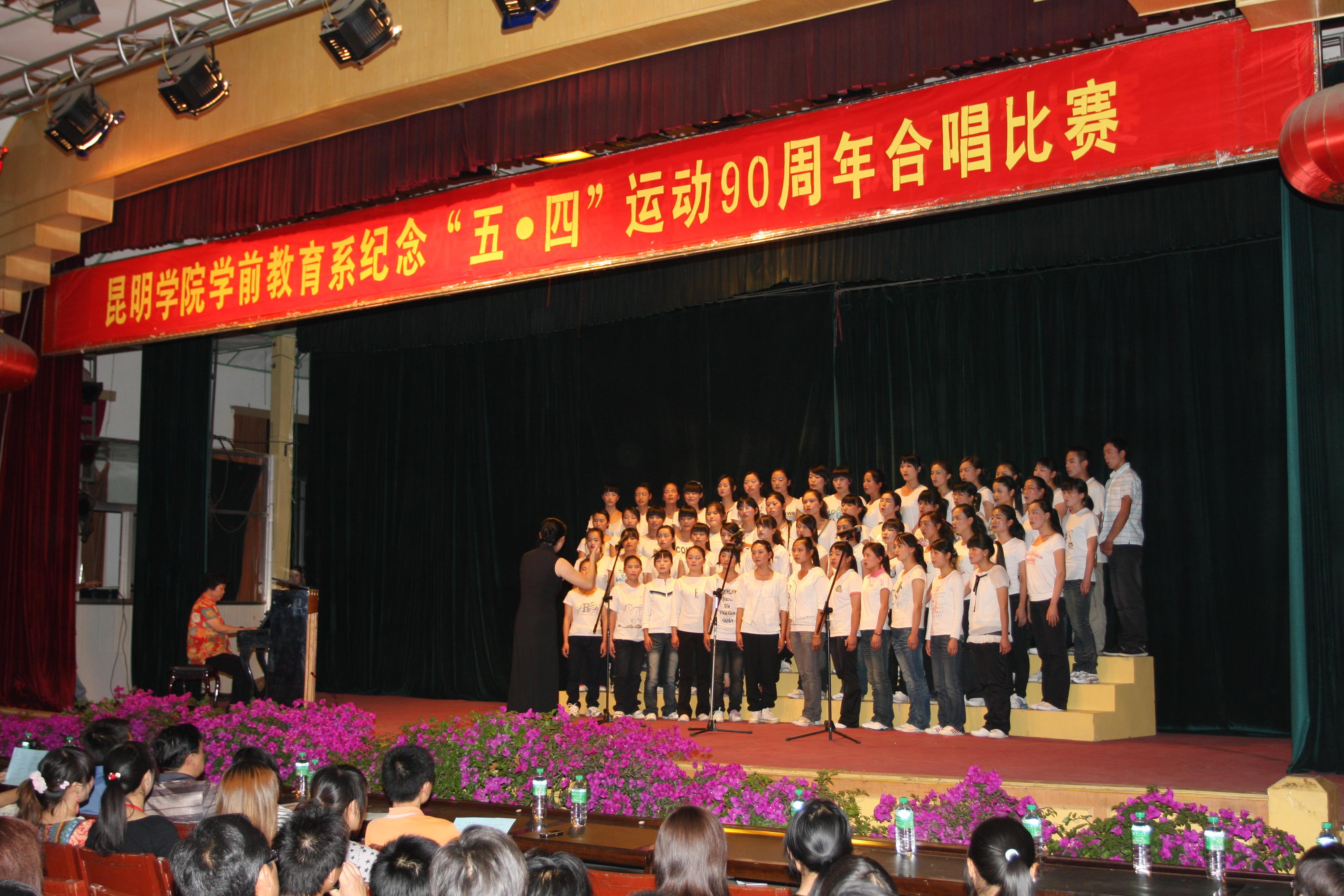 今年是纪念五四运动90周年,为在青年学生中广泛弘扬五四精神,传承历史使命,我院学前教育系结合专业特点,于5月8日晚7:30在昆师路大礼堂举办了“纪念五四运动90周年合唱比赛”。学院党委副书记孙勇,学生处处长吴蓉,团委书记何昊宸,团委副书记王海燕,计科系副书记王亚越,党委宣传部李思成老师作为嘉宾出席了活动。