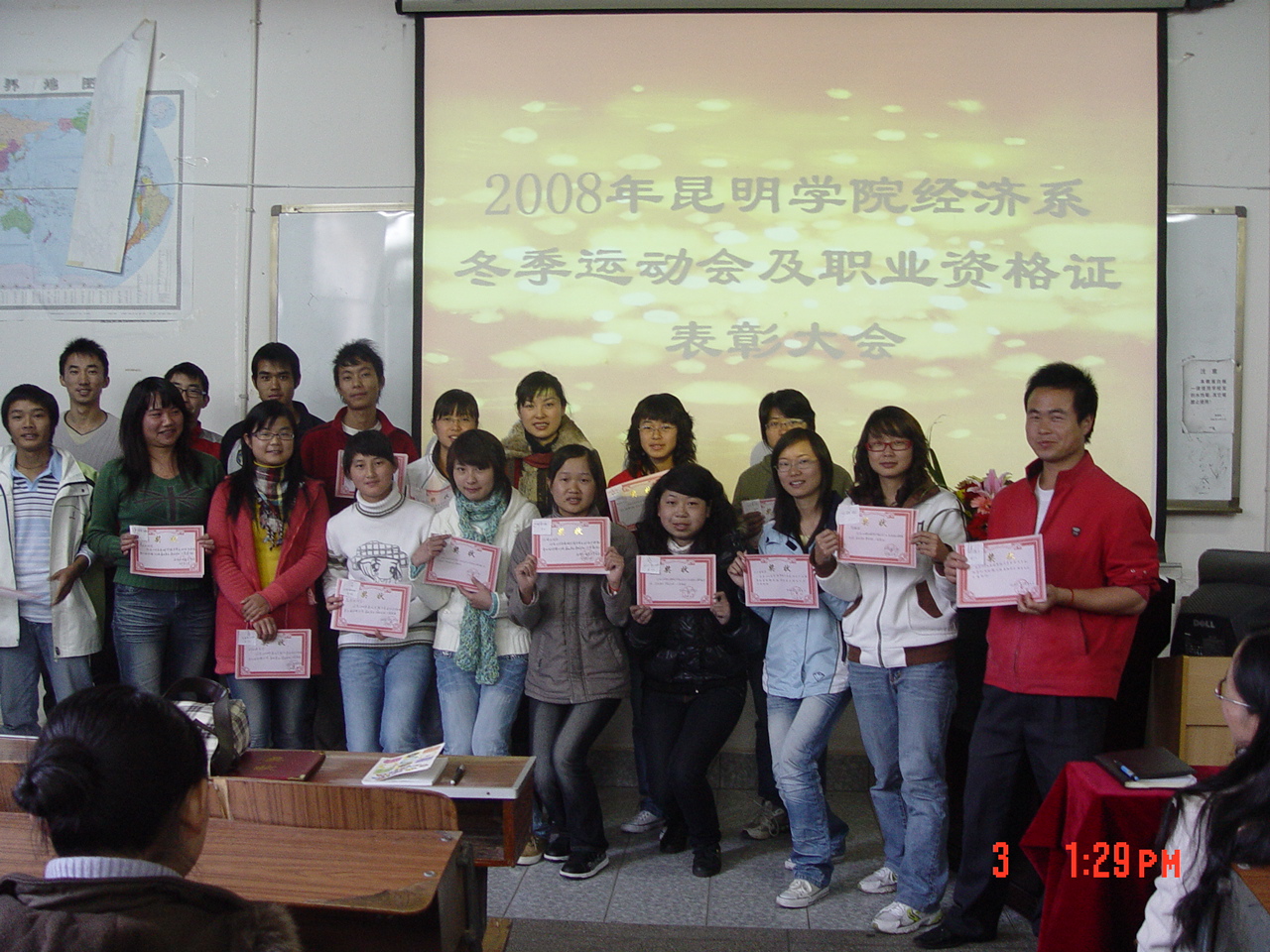 2008年经济系冬季运动会及职业资格证表彰大会于12月3日在四教阶梯教室隆重举行。经济系负责人博斌教授、党总支负责人李跃波教授、雷新华老师、林涛老师以及辅导员老师参加了会议。
