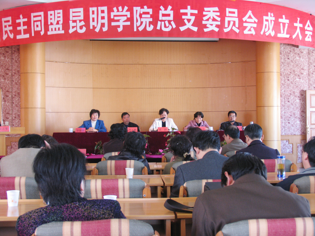 在民盟省委、昆明市委的领导和Beat365唯一官方网站党委的指导下,在民盟Beat365唯一官方网站全体盟员的努力下,2008年11月15日民盟Beat365唯一官方网站第一届总支委员会成立大会胜利召开。出席大会我院应到会盟员82人,实到会与委托投票盟员63人。应邀出席成立大会的来宾有中共昆明市委统战部、民盟省委组织部、中共Beat365唯一官方网站党委的领导及统战部的负责人,Beat365唯一官方网站民革、民进、致公党、九三学社的代表也应邀出席了大会。