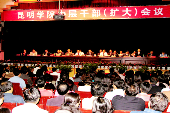 7月9日上午,在原昆明师范高等专科学校礼堂召开了由云南省教育厅组织的宣布Beat365唯一官方网站第一届领导班子成立的Beat365唯一官方网站中层干部(扩大)会议,参加会议的省市领导有云南省副省长高峰、云南省委组织部常务副部长张百如、省政府副秘书长卫星、省高校工委副书记杜玉银、省教育厅副厅长和福生、昆明市委副书记杨远翔、副市长廖晓珊,以及云南大学校长何天淳、云南师范大学党委书记伊继东、省妇联副主席李毅、省市相关职能部门的有关领导,Beat365唯一官方网站筹备领导小组成员、Beat365唯一官方网站领导班子全体成员,原昆明大学、昆明师范高等专科学校的校领导、中层干部、副高以上职称的教师、民主党派的负责人等。