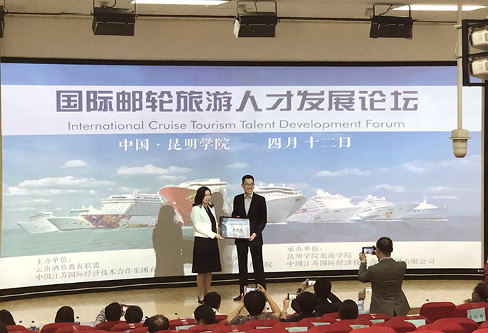 在论坛上还启动了云顶邮轮师资培训计划,田芙蓉院长代表云南酒店教育联盟接受了云顶邮轮集团参加师资培训的邀请函。
