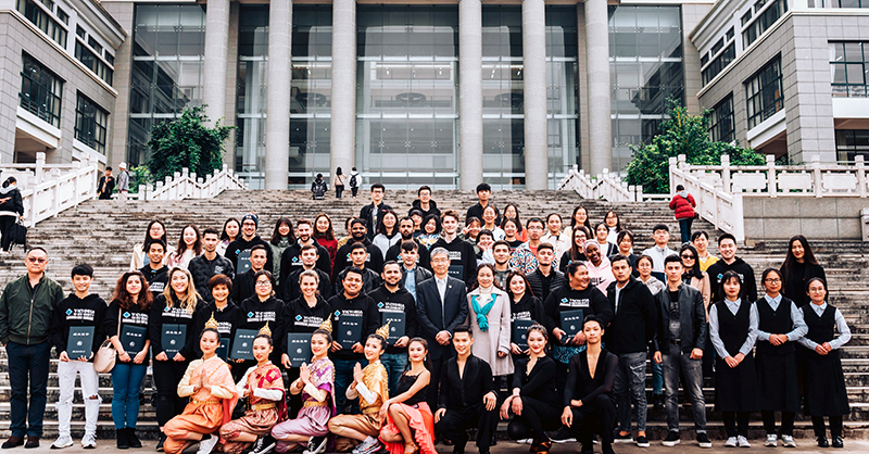 座谈会后,音乐舞蹈学院、外国语学院、国际学院等师生为对外经济贸易大学孔院师生展示了丰富多彩的课程和文化活动,在聂耳广场进行民族歌舞打跳,促进双方交流互动,给他们中国之行留下了美好的回忆。