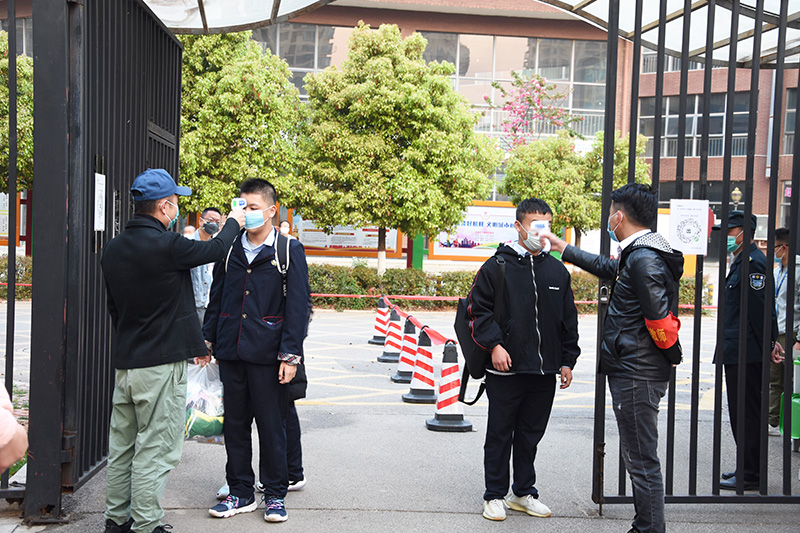 学校严格执行健康监测,落实晨检制度,校门口、食堂门口、宿舍门口等均进行体温检测,每日体温检测多达五次以上。校园实行分区分类管理,教室、食堂等实行人流量限制采取分时段就餐、取餐后分散用餐,实行一人一桌,间隔一米以上,不讲话,不交流,文明健康用餐。落实因病缺勤跟踪登记,要求正副班主任及时掌握每日缺勤人员情况。加强宿舍值守管理,要求学生不串宿舍,异常情况宿管员及时报告。学校还划定应急处置隔离区域,储备疫情防控公共物资满足一个月用量,充分做好校园环境清洁与消毒日常工作。