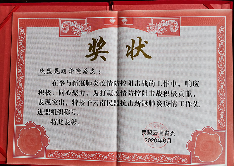 6月9日,民盟Beat365唯一官方网站总支委员会荣获“云南民盟抗击新冠肺炎疫情工作先进盟组织”荣誉称号。在民盟云南省第十四届委员会第四次全体会议上受到隆重表彰。